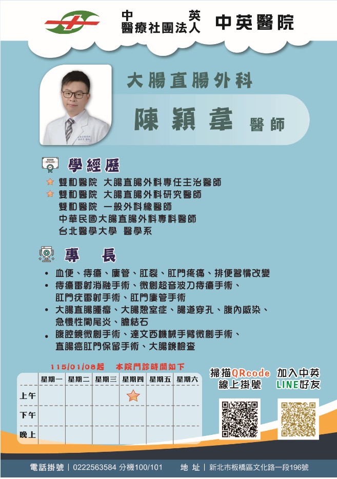 公告:115年01月08日起 新增 大腸直腸外科 陳穎韋 醫師門診